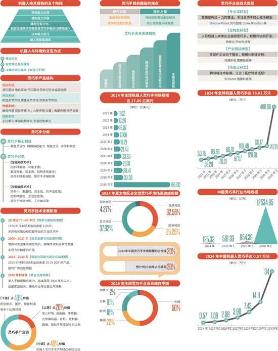 当前美国在灵巧手行业优势明显,而中国正在迅速积累技术经验,凭借庞大市场和政府支持等加快市场化步伐。数据显示,2024年,北美、欧洲、亚太地区的灵巧手市场规模占全球比例分别为32.56%、25.25%、37.92%。