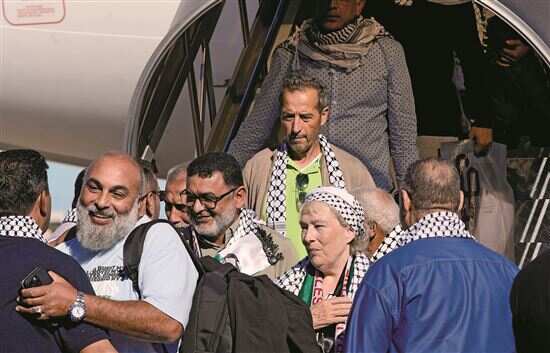10月8日,在利比亚首都的黎波里米提加机场,人们迎接被以色列扣押后释放的“全球坚韧船队”利比亚船只成员。