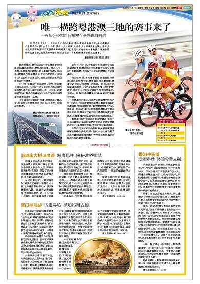 11月7日至9日,十五运会自行车(公路)比赛的角逐在珠海开启,本次赛事共产生男子个人赛、女子个人赛、男子个人计时赛、女子个人计时赛4枚金牌。其中,8日上午开赛的男子个人赛将横跨粤港澳三地,这是十五运会唯一粤港澳三地融合进行的比赛项目,也将成为中国体育历史上第一个实现跨境举办的正式赛事。