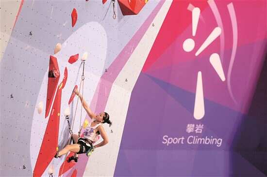 ■11月12日,十五运会攀岩首日比赛——男子难度和女子难度预赛在广州大学城体育中心极限运动中心举行。