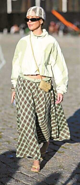 ▲运动上衣与修身半裙成为今季时髦组合,正式与运动感间的平衡碰撞出另类时髦感。