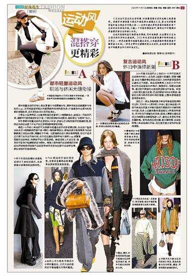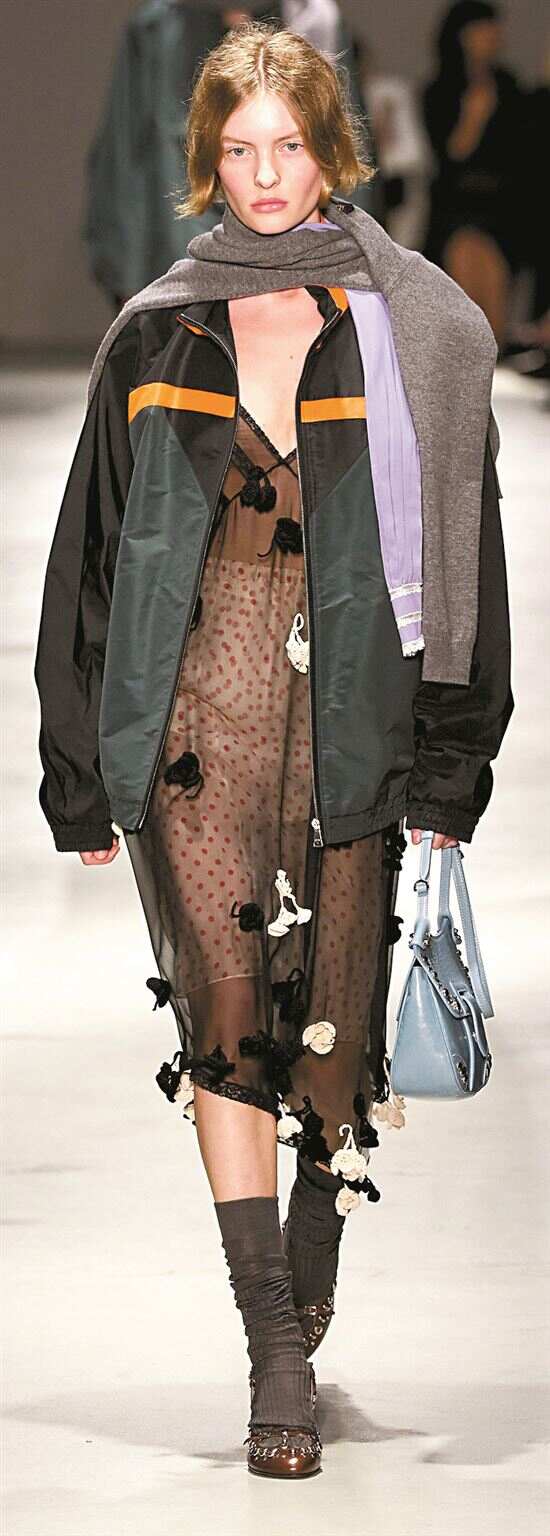 蕾丝、薄纱、针织等柔美单品能平衡复古运动单品的粗犷感,弥补可能出现的身材比例。