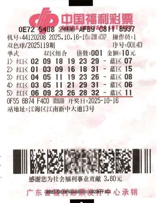 新快报讯 记者陆妍思 通讯员梁一鸣报道 双色球游戏第2025119期开奖中,全国共中出一等奖11注,其中1注花落广东江门市江海区江南新中大道13号铺的44120208福彩销售站点,中奖彩票是一张投注金额为10元的5注单式票,中奖奖金611多万元。