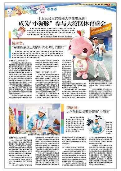 随着十五运会赛事的进行,吉祥物“喜洋洋”“乐融融”成为了互联网上的新任网红,志愿者“小海豚”们也因为积极热情的“营业”而广受好评。据了解,十五运会的“小海豚”志愿者,不仅有来自内地的,更有不少来自港澳地区,他们说“就是想参与到大湾区的盛会当中来”。