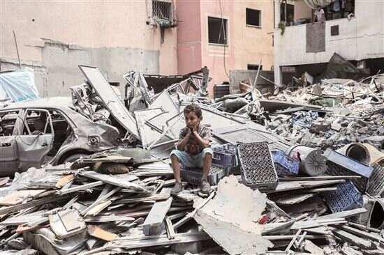 ■一名男孩坐在加沙地带北部加沙城以军袭击后的废墟上。新华社发