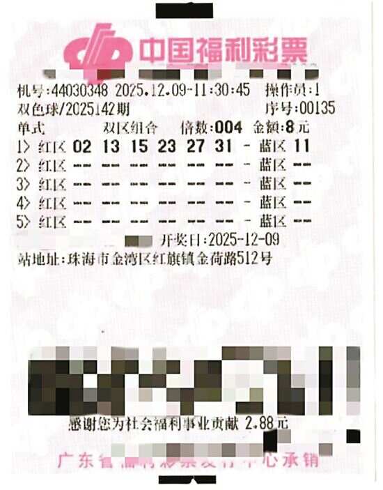 新快报讯 记者陆妍思 通讯员徐荣报道 福利彩票双色球第2025142期开奖中,珠海市44030348福彩销售网点中出4注二等奖,中奖彩票是一张投注金额为8元的4倍1注单式票,中奖总奖金126万元。