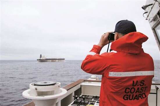这张美国欧洲司令部1月7日发布在社交媒体上的照片显示,一名美国海岸警卫队官员使用望远镜查看“贝拉1”号油轮。新华社发