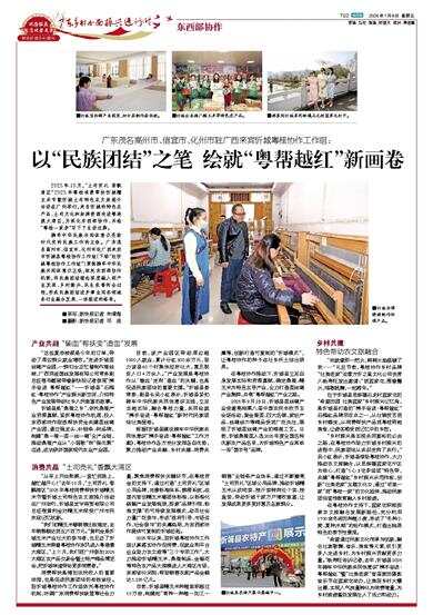 目前,该产业园区带动周边超1000人就业,累计分红800余万元,助力该县60个村集体经济壮大,惠及脱贫人口4万余人。“产业发展是粤桂协作从‘输血’走向‘造血’的关键,也是促进民族团结的重要支撑。”忻城县委常委、副县长吴小红表示,忻城县紧扣铸牢中华民族共同体意识主线,立足当地实际,融合粤桂力量,共同绘就“携手奋进·粤帮越红”新时代民族团结壮美画卷。