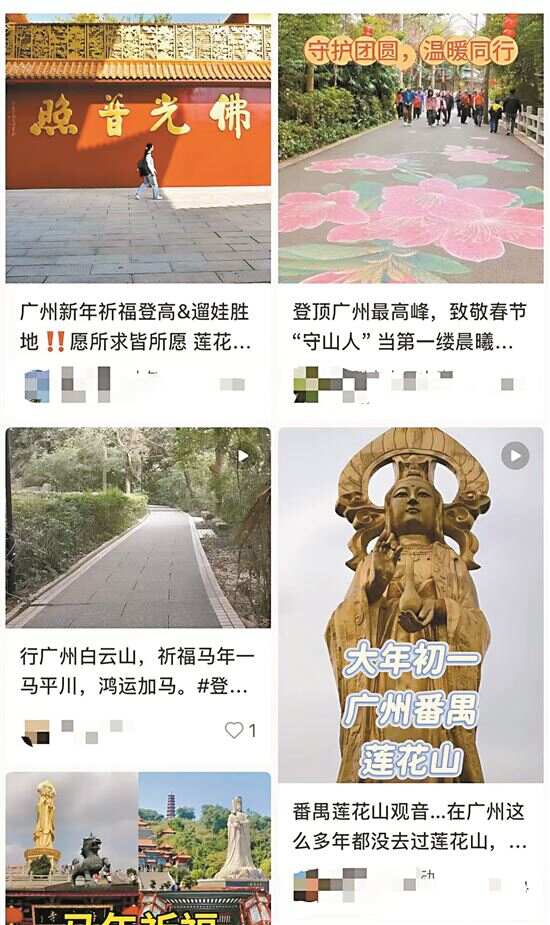 在社交媒体上,有不少广州地区的网友发帖晒出新一年的“祈福”贴,登高祈福热度较高,其中有运动徒步型选手,也有不少休闲登高型选手。番禺的莲花山、南沙天后宫、白云山、帽峰山和火炉山森林公园都是热门选项。