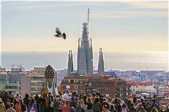 ■2月20日,在西班牙巴塞罗那,游客在桂尔公园远眺圣家堂施工。