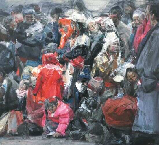 创作首要是研究个人的精神广度和深度,尤其是精神深度。对于用笔的强调以及对油画语言材料的研究也是贯穿造型和色彩的研究始终。用笔和材料运用适宜根据不同画面的整体需要进行不同程度的调整。具体实践分析:《雅鲁藏布》是我在2012年初赴甘南的拉卜楞寺参加当地的节日仪式后回来创作的作品。当时的我在滚滚的人流中,被身边涌动的虔诚的藏民们所感动,感觉人群的力量如巴比伦塔般,将他们的祝福送向上苍。在构思这张画时,我首先考虑到人群形成的向上的漩涡状是最想运用的形式,漩涡的底部起于左边的红衣后背女孩和右边的老妇人,顶端到藏母子止。色调采用低明度饱和色为主,这样最能承载我当时产生的对生命的无比深沉的感动,对信仰的深思。