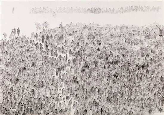 李周卫现在的作品在图式上最大的特征就是大面积的留白,这个可能跟当代艺术中某些油画作品的类似构图有关系。不过最重要的是,这种构图和她的创作主题很好地联系在了一起。特别能够反映我们在面对芸芸众生时的那种心境,由茫茫人海映射出对现实、人生、世界的看法。其实从她作品的题目就可以看出好几个层面的意涵,比如《我们从哪里来?要到哪里去?》对于人生的思考;《渡》对于个人及社会命运、彼岸及未来世界的思考。又比如《过客》《戏》《广场》等都是能够折射出丰富意涵的母题。对于她个人而言,应该是在一定生活经验的积累下的一种自然的思绪呈现,倒不是说每个话题都一直深入到哲学、社会学的层面。在画面情绪上,她似乎扮演的是一种冷静的旁观者的角色,在高处俯瞰都市里的人来人往。