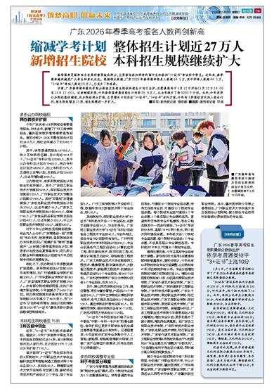 目前,广东春季高考最低录取分数线及各招生院校的招生计划已出炉,志愿填报将于3月12日开始(3月12日14:00至16日12:00)。记者梳理发现,今年春季高考整体招生计划约26.9万人,比去年减少了约5000个计划。此外,今年多所公办院校整体缩招,民办院校部分扩招,主要增长计划放在“3+证书”。“3+证书”本科方面,今年有3所高校首次加入招生行列,招生院校增至15所,招生规模进一步扩大。