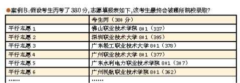 解析:根据平行志愿“分数优先、遵循志愿”的原则,当轮到该考生进行投档时,具体会被哪所学校录取要看所填报志愿的顺序。在本案例中,院校专业组志愿将被依次逐个检索投档,首先看第一志愿,从该校录取最低分337分可看出,考生丙投档时该校尚未录满,符合投档条件,因此考生丙将会被第一志愿的佛山职业技术学院801专业组录取。而广东轻工职业技术大学801、广州职业技术大学801、广州民航职业技术学院801等院校专业组虽然录取最低分高于337分且低于该考生成绩,但由于志愿顺序位置更靠后,因此也不会录取到该考生。因此,考生填报志愿,应参考院校往年录取情况,形成合理梯度。