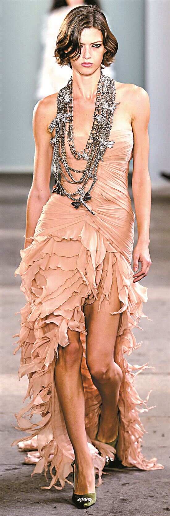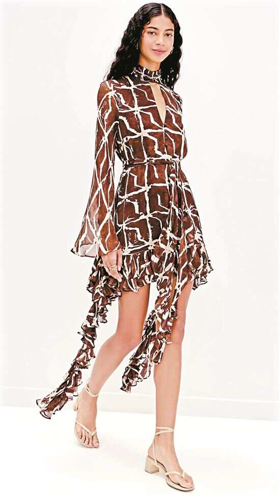 ▲如飘带般垂下的裙摆呈现不规则状以增加裙子的灵动美,给人自由随性的造型感。
