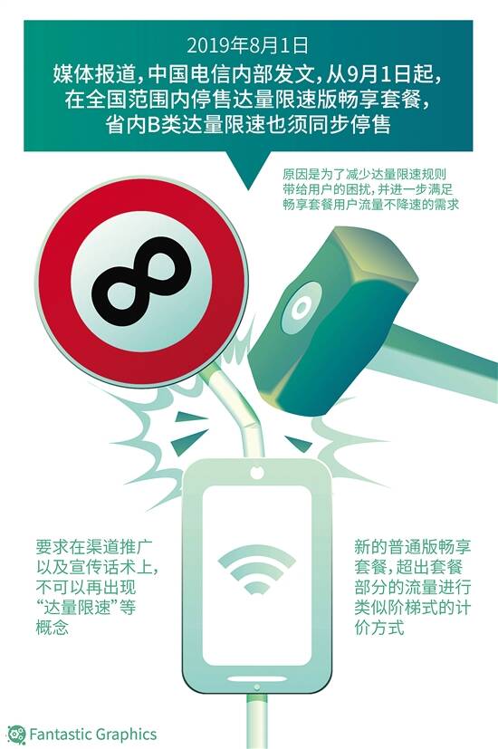 值得强调的是,这次的套餐调整并非如一些人误解的“9月起全面取消”,而是如何选择依然由用户决定。以前使用畅享套餐的老用户可以选择继续执行原套餐规则,也可以主动更换新版套餐抛弃“达量降速”,超量则用流量包(低至3元/GB,不用不收钱)。 到目前为止,中国移动和中国联通集团仍然没有回应是否会跟随调整同类达量降速套餐。 ■新快报记者 郑志辉 老版“无限量套餐”争议多 虽然另外两大运营商至今仍未表态,但按照以往几大基础运营商步调基本一致的传统,最终跟随的可能性依然极大,这也意味着运营商推出两年多的“不限量套餐”“无限量套餐”将开始进入历史。但同一事件,不同人的解读方法并不一样,有人说,这是“一种变相的涨价行为”,也有人认为是运营商为了迎接5G消费习惯而做的调整,最终同样会逐步降低用户的流量资费。到底是怎么回事呢? 回顾历史,当前运营商们所推出的种种“不限流量套餐”,其实是针对4G网络时代,各类视频、社交应用兴起,让用户对于流量消耗剧增带来天价账单的忧虑增多,由此催生了这种“不限流量”套餐,即用户在超过额定流量后就会被限速,但用户依旧可以“无限量”使用流量。没想到的是,用户反而认为这种国际通用的达量降速做法,属于虚假宣传,并非真正的“无限量”,工信部也发言“批评”称,此类“无限流量套餐”存在夸大、不实的宣传,要求三大运营商进行整改。 中国电信的内部文件显示,取消达量降速套餐是“为了减少达量限速规则带给用户的困扰”,也回应了工信部的监管要求。此外,有行业分析师认为,“取消不限量套餐”是运营商在5G资费出台前夜实施的过渡性措施,5G速度快且流量很大,原来的限量门槛明显偏低,这个时候取消门槛,有助降低套外资费。 新版畅享套餐采用封顶规则 不过,通信网络始终是受硬件所限的有限资源,不可能让所有人完全无限制地使用,取消限速意味着要有新的限制措施。根据中国电信的通知文件,在新规调整实施后,普通版畅享套餐增加封顶规则:上网当月套餐外流量消费600元封顶,之后暂停当月上网服务。客户当月申请继续使用,则继续提供服务。 具体来说,普通版畅享套餐的优化调整内容大致可以概括为:调整79元/99元/129元普通版畅享套餐套外资费为5元/1GB;199元及以上档位的普通版畅享套餐套外资费按3元/1GB收费。 可以预料到的是,新版套餐必然也会带出新投诉、吐槽,即会让部分习惯了无限量套餐不用担心单月花费过高的用户多了一层隐忧,一些人更指这是“变相涨价”的行为。 但实际并非如此。以79元的套餐为例,原版已经包含20GB免费流量,超量后按照5元/GB的价格,50元即可多用10GB流量,而按照工信部最新的统计数据,国内手机用户移动互联网接入流量(DOU)是7.8GB/月。也就是说,月花130元以内已经可以满足大多数用户正常的移动网络使用需求,绝对用不到600元的上限。 另外,对一般用户来说,将无限流量套餐变为普通流量套餐还有一个额外的好处,就是当月剩余的套餐内流量可以转到下个月使用,这是之前无限流量套餐没有的优势。 最重要的是,新老用户仍跟以往一样,可根据自身的需求自愿选择。