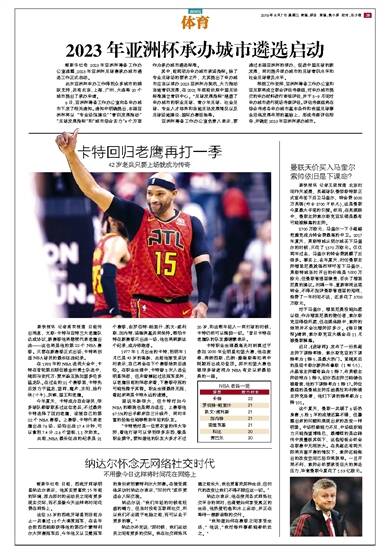 新快报讯 记者高京报道 日前传出消息,文斯·卡特与亚特兰大老鹰队达成协议,新赛季他将继续代表老鹰出战——这也将是他的第22个NBA赛季。只要在新赛季正式出场,卡特将创造NBA球