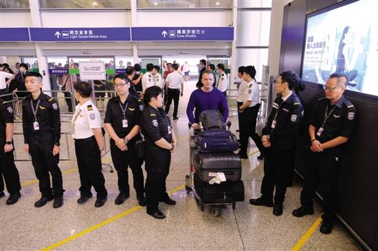 ■13日晚、14日凌晨,在机场非法集会的部分激进暴力分子对两名内地居民实施了严重的人身伤害行为。14日,香港机场管理局取得法庭临时禁制令,禁止任何人非法地及有意图地故意阻碍或干扰香港国际机场的正常使用。旅客经安保人员检查后才能进入机场。新华社发 |