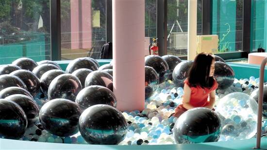 8月12日,在日本东京举行的“珍珠奶茶主题公园”媒体参观日活动上,一个女孩在珍珠奶茶造型的场景中玩耍。