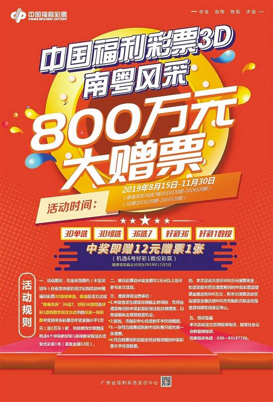 活动从2019年8月15日(南粤风采36选7第19220期、福彩3D第19220期)起至2019年11月30日(南粤风采36选7第19320期、3D第19320期)结束。其间,在全省范围内(不含深圳市)任意实体福彩投注站购买福彩3D游戏单选、组选投注方式或南粤风采36选7、好彩36及好彩1游戏数字投注方式中的任意一种彩票中奖且单张彩票总中奖金额小于1万元(含1万元)的,兑奖时均即赠送机选6个号码的好彩1游戏数字投注方式复式彩票1张(票面金额12元)。活动共安排赠票资金800万元。