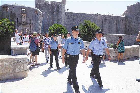 这是8月9日,参加中国与克罗地亚第二次旅游季警务联合巡逻的警官在克罗地亚南部城市杜布罗夫尼克街头巡逻。