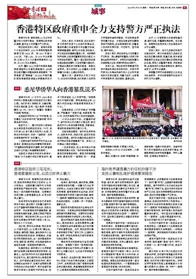 据新华社电 综合新华社驻外记者报道:连日来,海外各界持续发声,重申支持中国政府在香港问题上的立场,谴责香港发生的暴力事件及外部势力干涉,支持香港特区政府和警方依法止暴制乱,维护香港繁荣稳