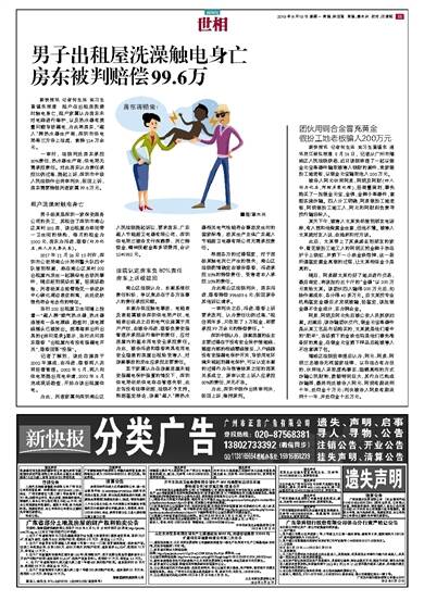 新快报讯 记者何生廷 实习生黄镇东报道 租户在出租房洗澡时触电身亡,租户家属认为房东未对电路进行维护,以及热水器有质量问题导致漏电,为此将房东、“超人”牌