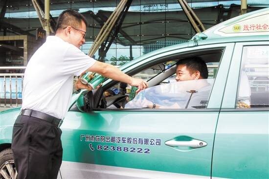 ■执法人员和慰问人员在白云机场为的哥送清凉饮料。 |