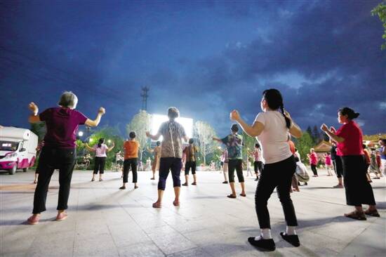 ■广东金融学院捐赠了巨幅屏幕和音响,每天傍晚,村民们聚在这里跳舞健身。 |