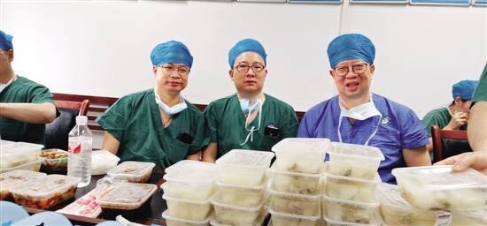 ■在贵州德江,钟惟德(右)教授与他的博士团队在紧张的手术间隙,吃盒饭充饥。 |