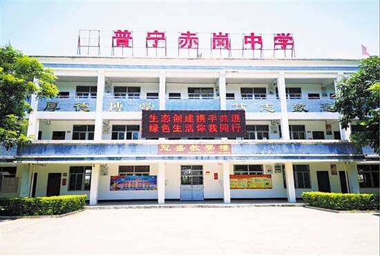 ■蓝楚汉先生捐资修建的普宁赤岗中学冠盛教学楼。 |
