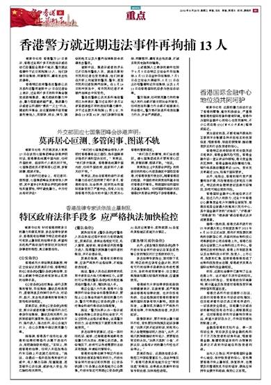 据新华社电 针对香港持续多日的暴力和混乱局面,多名法律专家表示,香港现有法律赋予特区政府诸多可有效止暴制乱的法律手段,希望相关机构严格依法行使职权并加快对涉事者的检控,真正彰显法治。