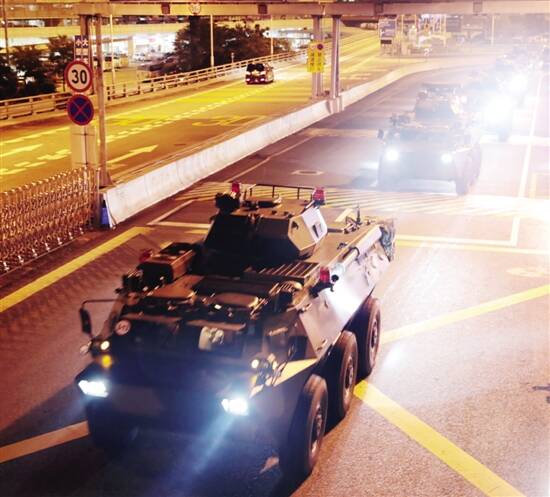 ■29日凌晨,解放军驻香港部队轮换陆军部队通过皇岗口岸。新华社发 |