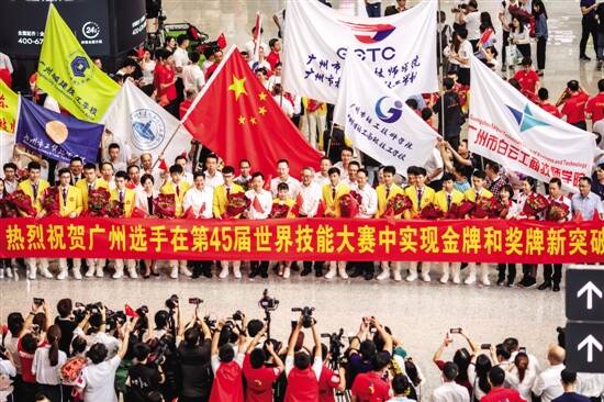 ■29日,参加第45届世界技能大赛的选手载誉归来。 新快报记者 毕志毅/摄 |
