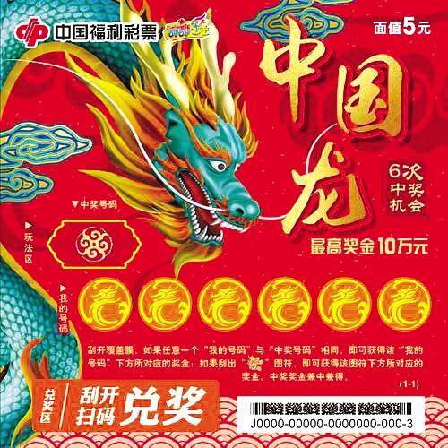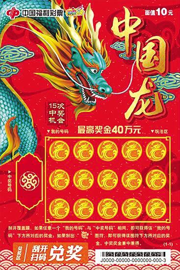 如何参与? 活动期间,凡购买广东(不含深圳)“刮刮乐”即开票单张彩票中得500元或1000元奖级且在2019年9月1日(含当天)后兑奖的中奖者,可获赠与中奖彩票奖金相同的整本“中国龙”(5元、10元、20元)即开票。 当活动合计赠送的“中国龙”即开票金额累计达到1900万元时,广东省福彩中心将向社会发布公告本次活动结束,赠票领取截止时间为公告活动结束次日20∶00前。 怎么领奖? 如果您在活动期间符合赠票条件,在完成“刮刮乐”彩票兑奖后,关注“广东福彩”微信公众号,进入“服务中心”功能菜单,选择“活动二维码”并向销售站点工作人员出示该二维码,在销售站点工作人员使用终端扫描“活动二维码”并成功登记信息后,销售站点将把赠票交给中奖者。 需要注意的是,符合赠票条件的中奖者,需在赠票领取截止时间前到全省(不含深圳)任一福利彩票销售站点兑换赠票,逾期不兑换者视为本人自愿放弃。本次活动的最终解释权归广东省福利彩票发行中心。 新票“中国龙”上市 头奖高达100万元 “龙”是中国的象征、中华民族的象征、中国文化的象征,堪称世界性的文化符号。为庆祝新中国成立70周年,中福彩中心推出“中国龙”主题即开票,近日在广东上市销售。“中国龙”即开票主题喜庆大气、票面精美。在祥云缭绕中,威风凛凛的青龙正在腾飞、气势如虹……“中国龙”主题即开票票面采用大红色调,配以金黄色点缀,风格磅礴大气、喜庆热烈。 “中国龙”一套三款分为5元、10元、20元三种面值,最高奖分别为100万元、40万元、10万元。“中国龙”玩法简单易懂。20元面值的“中国龙”,采用主流的对数字玩法,有30次中奖机会。刮开覆盖膜,如果任意一个“我的号码”与“中奖号码”相同,即可获得该“我的号码”下方所对应的奖金,如果刮出“龙”图符(见上右图),即可获得该图符下方所对应的奖金,中奖奖金兼中兼得。如果刮出“龙”图符(见上左图),即可获得玩法区内所有的奖金之和。 10元面值、5元面值的“中国龙”分别有15次、6次中奖机会,玩法同样简单:刮开覆盖膜,如果任意一个“我的号码”与“中奖号码”相同,即可获得该“我的号码”下方所对应的奖金,如果刮出“龙”图符(见上右图),即可获得该图符下方所对应的奖金,中奖奖金兼中兼得。