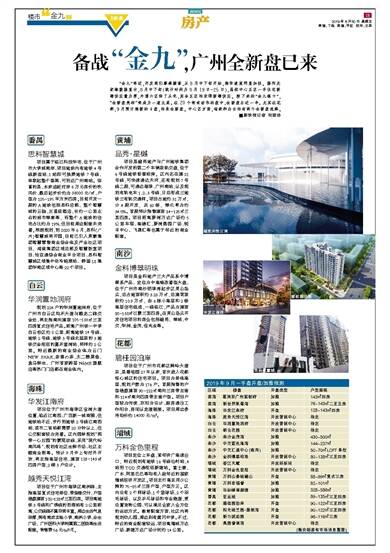 ■新快报记者 何璐诗 番禺 思科智慧城 项目属于临江科技华宅,位于广州市大学城南岸,项目地块内有地铁4号线新造站,1站即可换乘地铁7号线,串联起整个番禺,可到达广州南站。惊喜的是,本来追赶对岸6万元房价的吹风价,最后起步价约为38000元/㎡,户型为125-195平方米四房。目前开发一期的A地块包括思科总部、整个智慧城的云脑、五星级酒店、长约一公里左右的城市绿廊等,而整个A地块的住宅占比约为19%,但目前周边配套未完善。根据规划,到2020年6月,思科(广州)智慧城将开园,目前已引入莱蒙集团智慧零售商业综合体及产业社区项目、鸿骏集团区域总部及智慧饭堂项目、怡亚通综合商业平台项目、思科智慧城区域集中供冷能源站、韩国LS集团华南区域中心等22个项目。 白云 华润置地润府 规划224户的华润置地润府,位于广州市白云区均禾大道与鹤龙二路交会处,将主推南向建面105-133㎡三至四房复式住宅产品。距离广州铁一中学白云校区约2公里,距离地铁14号线、地铁2号线、地铁3号线北延段的3地铁交会枢纽的嘉禾望岗站,同样约2公里。附近最新的商业综合体为云门NEW PARK,奈雪の茶、太二酸菜鱼、盒马鲜生、广州首家跨层NǒME旗舰店等热门门店都在商业体内。 海珠 华发江南府 项目位于广州市海珠区宝岗大道位置,临近江南西、广百新一城商圈,但地铁站不近,步行到地铁2号线江南西站,或市二宫站都需要20分钟以上,但公交配套较为完善。区内园林规划“两带一心五园”的景观动线,采用“现代岭南风格”,规划有社区生鲜市场、社区主题商业街等。预计9月中上旬对外开放,将主推高层住宅,建面128-143㎡四房户型,2梯3户设计。 越秀天悦江湾 项目位于广州市海珠区南洲路,主推高层复式住宅单位,带装修交付,户型涵盖建面102-128㎡三至四房。项目离地铁3号线和广佛线的沥滘站有2公里距离,公交线路不算非常丰富。周边生活气息浓厚,拥有南武实验小学、南洲小学、合生广场、广州医科大学附属第二医院等生活配套。物管费5.6元/m2/月。 黄埔 品秀·星樾 项目是越秀地产与广州地铁集团合作开发的第二个车辆段轨交盘,位于6号线地铁香雪站旁。区内还在建21号线,可快速通达天河,还有规划7号线二期,可通达海珠、广州南站,以及规划有轨电车1、2、3号线,日后形成三地铁三有轨交通网。项目占地约31万㎡,分4期开发,共62栋,绿化率为约34.5%。首期预计推售建面84-125㎡三至四房。项目距离萝岗万达广场约5公里车程,高德汇,萝岗奥园广场,锐丰中心,飞晟汇等也属于邻近的商业配套。 南沙 金科博翠明珠 项目是金科地产三大产品系中博翠系产品,定位为中高端改善型大盘,位于广州市南沙明珠湾起步区灵山岛尖,总占地面积约3.23万㎡,总建筑面积约10.9万㎡,由6栋小高层和2栋高层住宅组成,一线临江,产品为建面80-138㎡江景三至四房。在灵山岛尖开发住宅项目的房企包括越秀、绿城、中交、华润、金茂、佳兆业等。 花都 碧桂园泊岸 项目位于广州市花都区狮岭大道东,是碧桂园27年以来,首次进入花都核心城区的住宅项目。项目为单体高层,规划户数为176户。首期推售的户型涵盖建面90-122㎡南向三房带主套和114㎡南向四房带主套户型。项目户型较为传统,双阳台设计,厨房通往工作阳台,房间以走道链接。项目周边参考均价约14000元/m2。 增城 万科金色里程 项目定位上车盘,紧邻济广高速出口,附近规划有地铁16号线仙村站,4站到TOD交通枢纽新塘站。富士康、广本、阿里巴巴等均有入驻邻近的国家增城经济开发区。项目主打高实用少公摊的75-85㎡三房户型,户型方正。区内设有2个网球场、1个篮球场、2个羽毛球场,以及乒乓球场和专业跑道,更设置宠物公园,可以满足全家人全方位的运动方式。教育配套方面,社区内将规划幼儿园,周边则有黄冈中学。不过,附近的商业配套较远,项目离增城万达广场、新塘万达广场分别约14公里。 2019年9月一手盘开盘/加推预测 区域 楼盘 开盘类型 户型面积 荔湾 葛洲坝广州紫郡府 加推 143㎡四房 荔湾 新世界凯粤湾 加推 76-143㎡二至五房 海珠 华发江南府 开盘 128-143㎡四房 海珠 越秀天悦江湾 开放营销中心 待定 白云 华润置地润府 开放营销中心 待定 白云 朗云花园 开放营销中心 待定 南沙 南沙金茂湾 加推 430-500㎡ 南沙 中交蓝色海湾 加推 144-237㎡ 南沙 中交汇通中心(商用) 加推 50-70㎡LOFT单位 南沙 金科博翠明珠 开放营销中心 80-138㎡三至四房 增城 香江天赋 开放样板间 待定 增城 万科金色里程 开放营销中心 待定 黄埔 万科山景城樾山 开盘 88-99㎡复式三房 黄埔 万科幸福誉 加推 82-101㎡ 黄埔 华标峰湖御境 加推 328-586㎡ 番禺 亚运城 加推 89-135㎡三至四房 花都 碧桂园泊岸 开盘 90-122㎡三至四房 花都 阳光城兰园·翡丽湾 开盘 90-122㎡三至四房 花都 新力琥珀园 开盘 96-116㎡三房 花都 奥园誉湖湾 开放营销中心 待定 (据安居客和市场消息整理)