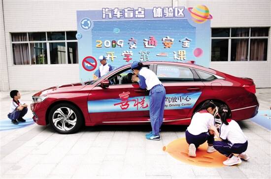 ■昨日,广州交警在海珠昌岗中路小学开展交通安全“开学第一课” ,让学生们体验汽车盲点等安全知识。 新快报记者 孙毅/摄 |