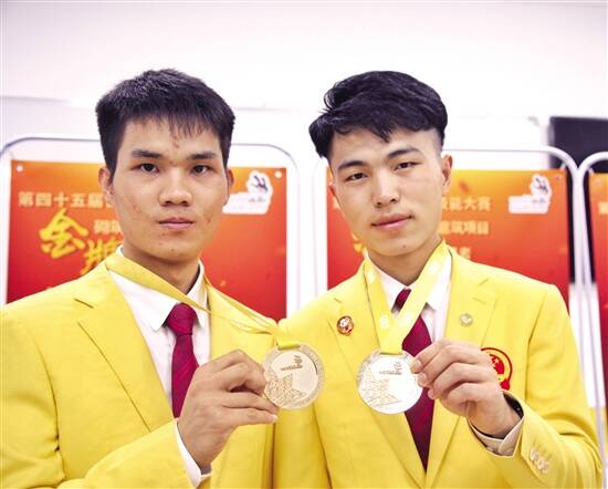 ■陈君辉(右)、李俊鸿获混凝土建筑项目金牌。新快报记者 李小萌/摄 |