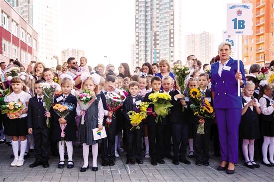 9月2日,在俄罗斯圣彼得堡,一年级新生和老师在一起参加开学典礼。 当日是俄罗斯学校新学期开学日。小学一年级的新生们在新鲜、欢笑和哭泣中开始了求学生涯。新华社发