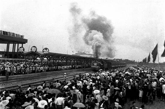 ■1952年7月1日由重庆开出的第一列火车,在2日上午到达成都车站,受到各界群众的热烈欢迎。 新华社发 |