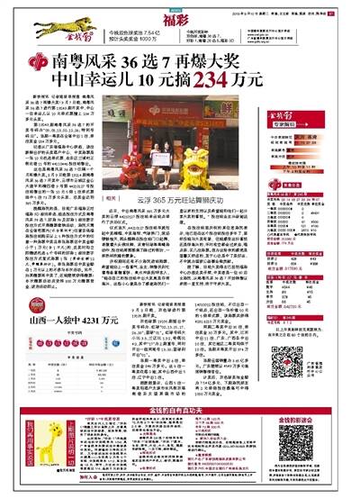 南粤风采36选7再爆大奖 中山幸运儿10元摘234万元