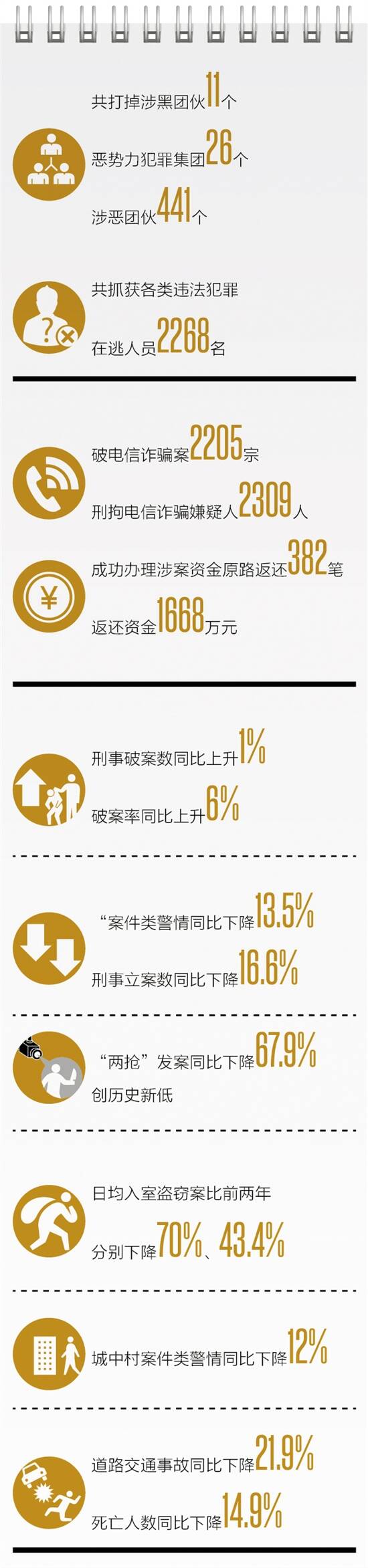 ■新快报记者 彭程 通讯员 李江华 林辉 【重拳出击】 社会治安秩序进一步好转 据了解,广州公安坚决抓好中央督导组反馈问题整改落实,纵深推进扫黑除恶专项斗争,共打掉涉黑团伙11个、恶势力犯罪集团26个、涉恶团伙441个,扫黑除恶成效继续走在全国前列。 在打击电信诈骗方面,广州公安全力开展打击电信网络诈骗、涉众型经济犯罪等专项攻坚战,深化整治黄赌行动,推进“全民禁毒工程”,严厉打击食药环违法犯罪,完善犯罪财富调查工作机制,实现行动战果全省排头兵、全国走前列。上半年全市“两抢”发案同比下降67.9%,创历史新低;日均入室盗窃案比2017年、2018年分别下降70%、43.4%;破电信诈骗案2205宗,刑拘电信诈骗嫌疑人2309人,成功办理涉案资金原路返还382笔,返还资金1668万元。 广州公安还积极打造“情报、指挥、巡逻、视频、卡口、网络”六位一体的“立体化、信息化、全覆盖”的社会治安防控体系,推进地上地下联勤防控一体化运作,进一步夯实“1、3、5分钟”防控圈布防,规范突发公共事件组织指挥及力量调用,完成区级快反处突专职队伍组建,实行重点时期直升机空中巡逻机制,圆满完成重大活动安保维稳及应急处突工作。 广州警方还加快警务移动APP推广应用,推行“公安网+盘查”等勤务模式,共抓获各类违法犯罪在逃人员2268名,并积极推进智感安防区建设,抓好市级示范点建设,构建治安防控多维信息感知圈,创新支撑管理、服务实战区域防控新模式,预测预警预防水平进一步提升。 【共建共治共享】 公共安全治理基础进一步夯实 广州警方运用“借力+嵌入+融合”社会治理新理念,进一步压实单位安全主体责任,推动单位“看好自己的门、管好自己的人、护好自己的院”。值得注意的是,广州公安开展城中村治理攻坚战,以大源村、人民南等重点地区整治破解区域治安难题,涉城中村案件类警情同比下降12%。 同时,广州警方持续深化“四标四实”应用,数字广州基础应用平台已汇聚2.57亿条城市基础数据,全市28个政府部门已应用平台数据,提升了城市精细化治理水平。通过完善网络安全监测机制,加大网络安全防范力度,及时通报并督促相关单位整改,保障了全市网络安全运行。 此外,警方大力开展交通安全综合治理攻坚战,全市道路交通“四项指数”全面下降。其中,发生道路交通事故同比下降21.9%,死亡人数同比下降14.9%。广州公安还注重抓好民生实事工作落实,完成市妇儿中心周边道路等12个拥堵节点的双微改造,有效缓解了局部交通拥堵及秩序混乱状况。 而围绕建设粤港澳大湾区战略,广州市公安局制定了《广州市公安局关于推进粤港澳大湾区建设的实施意见》,推出20项重点服务管理措施。深化“放管服”改革,推出《广州市公安机关服务民营经济发展三十条》,取得良好社会效果。 通过深化智慧新警务建设,推进大数据技术支撑体系建设,累计数据总量已经达到2782亿条,推广移动警务等技术应用,进一步完善了立体化、信息化社会治安防控体系和突发事件预警应急处置机制。 【从严治警】 队伍实战能力进一步提升 广州公安认真学习贯彻习近平总书记视察广东及在全国公安工作会议上的重要讲话精神,深入贯彻落实《中共中央关于加强新时代公安工作的意见》,坚持党对公安工作的绝对领导,突出党建引领和政治建设,开展基层党支部建设攻坚战,组织全局党支部副书记集中轮训,深化基层党组织建设,推进“头雁”“堡垒”“先锋”项目创建,促进基层党组织战斗力提升。 与此同时,广州公安常态化开展队伍分析、风险排查、谈话提醒管理,强化重点工作督察和“一日清”工作机制,以抓铁有痕、踏石留印的工作作风,推动风险隐患落地“清零”,确保了政令警令畅通、各项决策部署落地见效。大力开展严格规范公正文明执法攻坚战,组织开展执法办案应知应会和基本技能培训班10期,800多名基层所队领导参训,执法办案水平和执法公信力不断提升。 今年5月,广州公安组队代表中国警察参加第21届世界军警狙击锦标赛,取得了中国代表队自参赛以来的最好成绩,得到了上级领导的高度肯定和表扬。6月25日,广州市公安局出入境管理支队二大队获评第九届全国“人民满意的公务员集体”,是广州市唯一受表彰对象,该大队教导员黄月玲作为受表彰集体代表,受到中央领导亲切接见。 接下来,广州公安将按照市委、市政府和上级公安机关的统一部署,切实履行好广州公安的职责使命,深化严打整治专项工作,全力防范化解重大风险隐患,全面提升社会治安治理水平,不断营造社会治理共建共治共享新格局,努力创造平安稳定的社会环境。