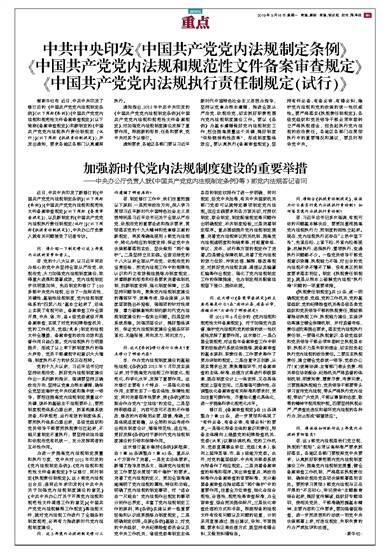 中共中央印发《中国共产党党内法规制定条例》 《中国共产党党内法规和规范性文件备案审查规定》 《中国共产党党内法规执行责任制规定(试行)》