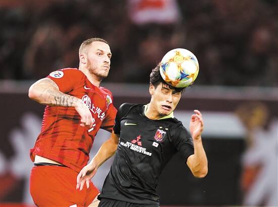 ■在双方第一回合比赛中,上海上港在主场以2:2战平浦和红钻。上港球员阿瑙托维奇(左)在比赛中争顶。 新华社发 |