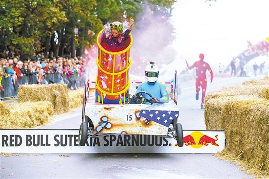 当日,“肥皂盒车”趣味比赛在考纳斯举行。参赛者驾驶造型各异的自制无动力“赛车”沿山坡滑行约500米,中途还要躲避草垛、急转弯、跳板、水池等障碍。这项活动2000年发源于比利时,而后逐步变成有一套特定规则的趣味比赛。