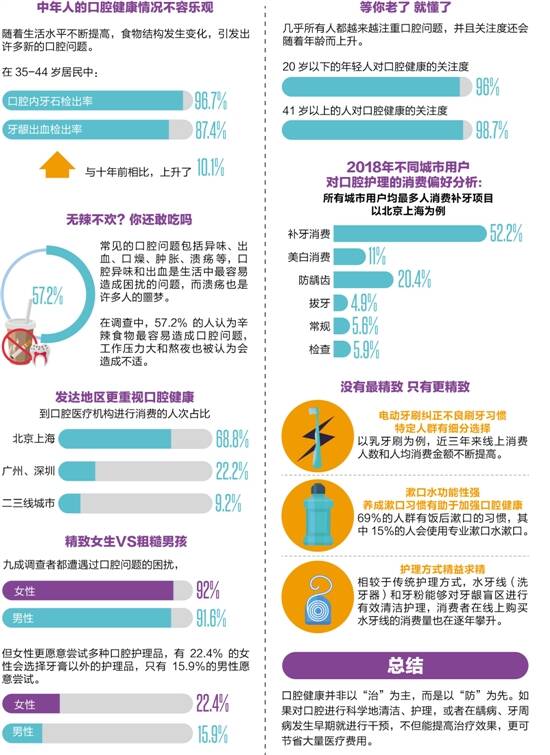 2019年迎来了全国第31个“全国爱牙日”,随着国家宣教深入,人们对于口腔健康越来越重视,但大大小小的口腔机构,资质参差不齐的口腔医生,市民应该如何选择正确的机构和医生?不同的牙科机构有什么区别?种牙前要问医生哪几件事? 为助力市民安全看牙不花冤枉钱、不受罪,积极响应国家号召,贯彻落实《健康中国行动(2019—2030年》和《健康口腔行动方案(2019—2025年)》有关要求,进一步提升群众口腔健康素养水平,促进口腔健康行为的形成,新快报、德伦口腔连锁和艾媒咨询联合发布本期内容。 广州德伦口腔连锁作为连锁口腔领跑品牌,迄今为止先后在广州、佛山等地开设了9家高端口腔分院,设有九大科室:种植科、正畸科、修复科、牙周科、口内科、口外科、儿牙科、麻醉科及检验科;两大中心:洁牙中心、数字化设计中心。目前拥有100多名全职注册博硕专家及200余名专业护理人员的庞大医护团队规模,其中百余位资深博硕口腔专家团,平均临床经验全部在15年以上,引导消费者选择正规口腔医院,不走冤枉路,不花冤枉钱。 ■数据来源:艾媒《2019中国口腔护理行业现状》、腾讯《2017年中国国民口腔健康状况调查报告》、阿里健康《2019饮食习惯与口腔健康白皮书》、 中华口腔医学会联合中国疾控中心和全国35家口腔医学院校调查数据 采访实录 ●黄先生 35岁 互联网公司IT ●陈女士 24岁 企业HR ●林同学 22岁 海外留学 1. 您做过哪些口腔项目?认为它是必须的吗? 黄先生:年轻的时候龋齿问题比较严重,一开始不太在意,直到后来越来越影响生活才去医院补了三颗牙,我还记得当时医生跟我说要是再严重些伤及牙冠,需要更长周期的治疗,也是从那时候才逐渐开始注重牙齿健康,不过补牙后需要避免吃冷的和硬物。 陈女士:总的来说我的牙齿状况是没有什么大问题,所以我做的项目主要是牙齿美容方面。以前我还没有这个意识去保护牙齿,后来也是因为不少朋友推荐所以才去试了试。除了定期洗牙外,还做过一次美白项目,目前来看效果不错,不过医生也说了关键还是平时的清洁措施要做好。 林同学:我是上个月才开始了我的正畸生涯,以前读中学的时候因为觉得戴牙套很不美观,所以一直拖到如今,医生也说因为年龄问题戴的时间要更久一些,所以个人而言,我觉得如果牙列不齐或者一些咬合问题比较严重的话,尽早正畸还是必须的。 2. 在医疗机构的选择上,您更倾向于去公立医院还是连锁口腔诊所呢? 黄先生:如果是简单的拔牙、补牙项目我会去比较有知名度的口腔诊所,因为公立医院排号比较麻烦,小项目的话我觉得没必要特地请假去看病,工作也比较走不开。 陈女士:我一直是去公立医院的,因为牙齿美容项目的号其实不算特别难拿,况且以前我会对口腔诊所有偏见。不过听说这几年管理也比较完善了,之后会去多了解一下。 林同学:在决定正畸之后我也跑了不少公立医院和连锁诊所进行面诊和咨询方案、价格,我觉得各有各的好吧,重点是还是要看方案和沟通度,选择一个跟你审美相符合的主治医师。 3. 您在牙齿方面是如何进行日常清洁和保护的呢? 黄先生:在饮食上我会比较注意,少用补牙那侧啃硬物或者是少吃一些生冷的东西,日常也会购买一些功效性牙膏。 陈女士:我现在使用的是电动牙刷,对我来讲比手动的清洁效果要更好,洗牙也洗过两次,不过我认为还是不能太频密,重点还是自己在日常生活中要多注意。 林同学:戴上牙套后,我准备了一整副专业的清洁用具,比如专业的正畸牙刷、牙线、冲牙器等等,每次吃完东西必须要走完一套清洁流程,医生说要是不注重日常清洁,会在矫正期间出现更多的牙齿问题。