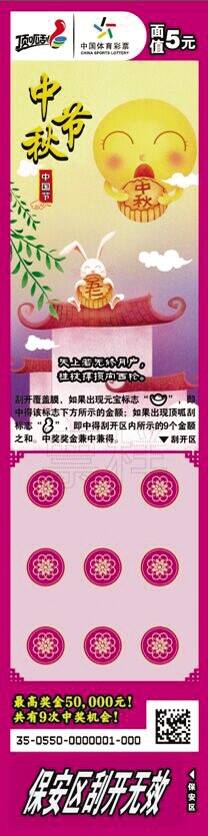 体彩顶呱刮之前发行过多种文化类主题彩票,尤其是每年春节期间,都会发行生肖票、年票等。不过,像本次这样把春节、元宵节、清明节、端午节、七夕节、中秋节、重阳节等具有中国传统文化特色的节日“一网打尽”还是首次。该款套票通过中国传统节日丰富的内涵,彰显了深厚的文化底蕴,并向购彩者传达出团圆、思念、亲情等情感,每个票面上都有一句应景的诗文,更加透露出浓浓的文化气息。 “春节”票面为一家三代吃年夜饭的场景,屋内爷爷奶奶给孙子孙女发红包,屋外礼花朵朵,这就是家家户户过除夕的场景。“共庆新年笑语哗,红岩士女赠梅花。”语出董必武的《元旦口占用柳亚子怀人韵》,意思是大家团聚在一起共同庆祝新年的到来,笑语喧哗,十分热闹,红岩村的年轻同志送来梅花,更增添了节日气氛。 “七夕节”的票面为隔着“天河”的牛郎和织女在鹊桥上相会的情景。“七夕今宵看碧霄,牵牛织女渡河桥。”语出林杰的《乞巧》,意思是一年一度的七夕又来到了,家家户户的人们纷纷情不自禁地抬头仰望浩瀚的天空,这是因为这一美丽的传说牵动了一颗颗善良美好的心灵,唤起人们美好的愿望和丰富的想象。 其他几个节日的票面设计也都体现出各个节日的特点。值得一提的是,“中国节”票面尺寸创新设计,兼具书签的使用功能,极具收藏价值。 ●头奖5万元 “中国节”单票面值5元,头奖5万元,具体游戏规则为:刮开覆盖膜,如果出现元宝标志,即中得该标志下方所示的金额;如果出现顶呱刮标志,即中得刮开区内所示的9个金额之和。中奖奖金兼中兼得。 ●购一张捐1元 购彩者每购买一张面值5元的“中国节”,将有1元成为体彩公益金。体彩公益金广泛用于包括补充社会保障基金、医疗、助学、扶贫、残疾人事业、法律援助、全民健身等公益事业。