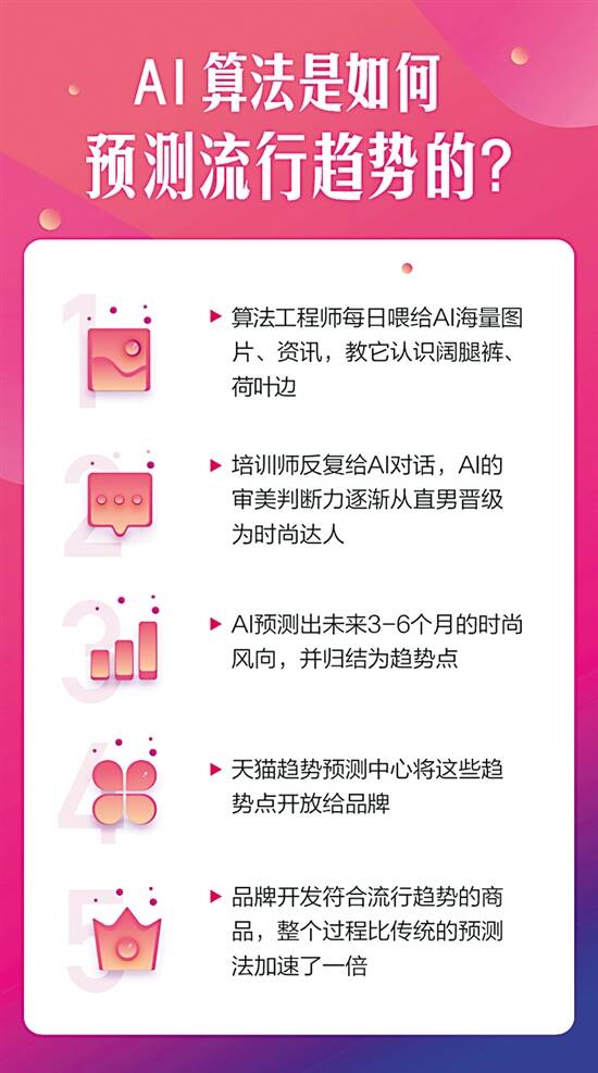 近日,天猫联手太平鸟、三枪、YIRANTIAN、SHUSHU/TONG等中国品牌相继登上纽约、米兰等世界顶级时装周,品牌们亮相T台的多款糖果色西装、夸张荷叶边上衣、满印打底T恤引发时尚圈疯狂打call,而这些走秀款的设计元素均来自天猫AI算法对2020年春夏流行趋势的提前预测。 “天猫已经建立起一整套流行趋势的预测模型,通过AI算法预测未来半年的走红设计,帮助品牌把生产研发的周期整整提前6个月。”天猫趋势算法工程师天术表示。 据了解,早在200年前,在被誉为世界时尚之都的法国巴黎就诞生了时尚趋势预测这门生意,二战结束后,专业的预测机构更是遍地开花,影响力越来越大,时装的趋势预测、生产、流行链条也被中国品牌所效仿,并变得全球化了。 而如今,天猫通过对AI的深度培训,让趋势预测的流程进一步缩短,品牌提前半年就能按照这一套方法论进行生产和研发,整个创意周期,在以往需要一整年。 将趋势点变为未来明星爆款,幕后推手是天猫趋势预测中心。在这支神秘团队里,AI训练师们负责每天收集海量的时尚趋势点,像老师给学生划重点那样,教育AI自主学习,趋势点们被吃透后,AI就能反复地通过来自社交媒体、电商平台的消费数据去校验这些趋势点的热度,从而达到预测趋势的效果。 “AI的认知一开始犹如一名直男,随着训练的深入,它会渐渐变得时尚,甚至成为未来时尚领域的预言家。”天猫趋势中心AI训练师亦声表示。“当然,在培训的过程中,必然渗入一些主观的判断,培训师和算法工程师的判断决定着AI的成长性和对趋势预言的准确性。” 除了预测流行外,天猫趋势预测中心还深入到对品牌供应链的打通上,以求孵化明星单品,推动品牌供应链的快速反应。今年,天猫携手九大中国品牌登上了纽约、巴黎、米兰等三大世界顶级时装周,这些走秀的款式中就大量应用了趋势中心对于未来半年趋势的预测。而品牌们的生产、响应也十分迅速,从趋势词到秀场款,整个流程不到三个月。
