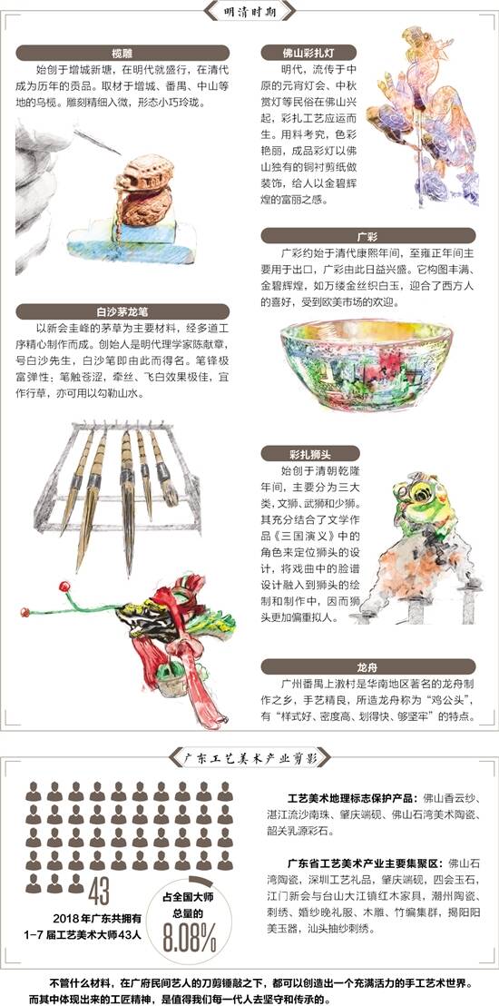 同为女子,同样学习美术出身,同是手艺人,欧琦辉的生活则是另一个样子。她是佛山狮头(彩扎)国家级非遗传承人黎伟的嫡传弟子,黎家狮第六代传承人,美术高级教师。 欧琦辉与狮头结缘时已是一个孩子的妈。那年,她和丈夫带着小孩一起去佛山祖庙看舞狮。“快看!刘关张狮头!”一个外国孩子兴奋地说。什么是刘关张狮头?为什么一个外国小孩能轻易说出?欧琦辉颇感震惊,自此走上了拜师学艺之路。 所谓刘关张,是指狮头的三大形象。佛山狮头扎作技艺源于明代,清代乾隆年间正式在当地兴起。当时的扎作师傅从粤剧脸谱中汲取灵感,创造性地制作出了五彩刘备面、红狮关公面、黑狮张飞面的狮头形象,并延续至今。了解到这些之后,欧琦辉便敲开了佛山狮头(彩扎)国家级非遗传承人黎伟的门。 佛山狮头的制作属于“彩扎”,工序十分复杂,从扎作、朴纸、写色到装饰,分解下来有1300多个步骤。扎是指要先用竹篾、纱纸为主要材料扎出狮胚;朴是用纱纸、纱绸为原料朴狮,将狮胚做出模型,一般里外盖三层纱纸,中间用纱绸将狮胚糊起来,呈现出一个简单的轮廓,糨糊中加入明矾可使得狮头制作完成后避免被虫蛀;写即是用油彩上色,勾画花纹,将狮头的特征和主色调表现出来,勾画性格以及细节;最后组装时,要用可活动的连接装置把下巴、睫毛和耳朵组装起来,便于这些部位能自由开合,生动活跃。 据称,佛山存在几户做狮头的人家,其中黎家狮最出名。真实的黄飞鸿当年便是用的黎家狮,狮队经过店铺门口时还要叩头以示感谢。李连杰主演的“黄飞鸿”系列电影中也用了许多黎家狮。 在欧琦辉的工作室里,记者看到了磁悬浮3D打印狮头摆件、3D打印狮头装饰灯、亲子手作——狮头信箱等狮头工艺品。它们体积偏小,外表简洁,又富有现代科技感,是符合现代人审美的宜室宜家好摆件。欧琦辉说,“我现在的责任是宣传和弘扬狮头文化,这里边有太多的故事。我要告诉更多的人,狮头不仅与武术有关,还与粤剧有关,与宗教有关。” 公共空间 太古汇承载街坊文化记忆 与欧琦辉工作室相距30多公里的广州天河区,太古汇总经理黄瑛也一直努力把老广从前所叹所赏之物展示给更多的人。 位于天河中央商务区核心地段的广州太古汇,从不吝惜寸土寸金之地,更是变着法儿将它变成广府美工集聚空间。2017年丁酉新春,广州太古汇携手琉璃工房呈献堪称华南区最大的室内琉璃艺术展,臻美殿堂级琉璃国粹首次礼献广州。2018年2月,广州太古汇戊戌年新春活动邀请国家级非遗项目广东剪纸的代表性传承人陈永才之首徒饶宝莲创作了大型剪纸作品,共计展出8幅经典贺年剪纸作品,及88个各式各样的“福”字。2019年新春,广州太古汇展出了来自清朝的广彩文物、广彩国家级传承人的金奖作品以及新广彩创意艺术品。 从小在西关长大的黄瑛,对广府传统美工艺品具有特殊的感情。“在我小的时候,那边有很多好看的好玩的东西,上下九还有一个玉雕厂,这些构成了我的童年记忆。我希望能够更加理解广府文化,继承它,发展它,让我们的下一代更加喜欢和欣赏它。” 正是基于这份初心,黄瑛希望在商业营运之外,广州太古汇能为文化保育贡献一份力量。在黄瑛看来,商场不同于博物馆等封闭展示空间的地方在于,它的天然属性是公共的,而且通常位于一个社区的核心位置,拥有宽敞的室内室外场地,这一切都使得商业购物中心在推动公共美学教育、公共文化传播方面有着不可比拟的优势。来自不同城区的顾客、每天通勤的上班族、周边社区的居民,每天有大量人群汇聚于此,因此通过广州太古汇空间这个枢纽辐射出去的文化能量,可以被成倍地放大,传递到更远的城市角落。而且,这种融入在生活之中的文化能量是鲜活的、是极具生命力的,是传统文化艺术得以走进民众、连接下一代人所需要的纽带。 今年7月-8月,记者在广州太古汇商场三楼看到了“衍艺时空”艺术项目系列活动之“启航——广州美术学院2019毕业作品精选展”,戏服、广绣等传统广府美工元素在周立均等毕业生的影视动画作品中呈现。“太古汇扎根于广州这个城市,应该与这个城市共同成长,我们希望在空间上与消费者产生情感连接,通过给大家带来的艺术文化,形成永久的空间记忆,从而促使下一代对广府文化进行思考、发展、创新,以传承这个城市的文化和精神。”黄瑛说。 ■参考文献:刘介民《广府民俗艺术审美》 ■数据来源:工业和信息化部工业文化发展中心《工艺美术产业白皮书(2018)》 ■策划:罗韵 黄海滨 ■统筹:新快报记者 梁彧 ■采写:新快报记者 王彤 ■摄影:新快报记者 李小萌 ■制图:廖木兴 ■视频摄制:陈文峰 莫根源 实习生 范梓烨 ■通讯员:李霜银 吉兰兰 卢清柳 杨楚薇 ■特别鸣谢:广州市非物质文化遗产保护中心 佛山市祖庙博物馆