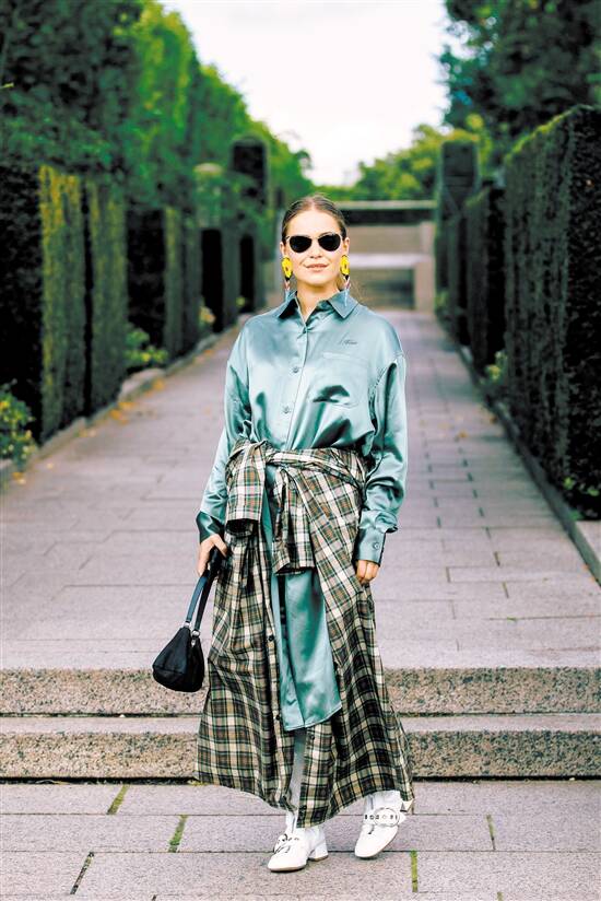▲ 两件衬衫裙也可以叠搭在一起,将其中一件衬衫裙系在腰间制造腰线,还能充当裙摆,增加层次感。 |